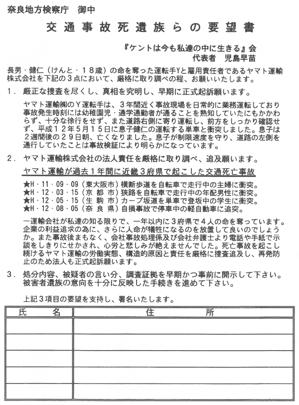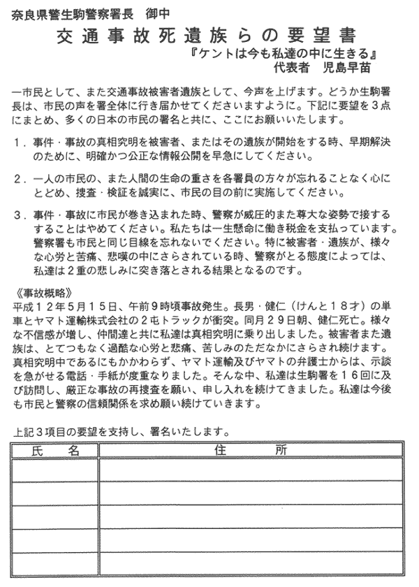 2001年の2月から近鉄生駒駅、奈良駅で署名活動を行ってきました。生駒署、奈良地検に事故状況の情報開示や事故原因究明を求める署名です。わずか2ヶ月の間に14,000名の署名を集めることができました。この署名の数は、交通事故という大きな社会問題に対する皆さんの関心の深さを物語っているのではないでしょうか。